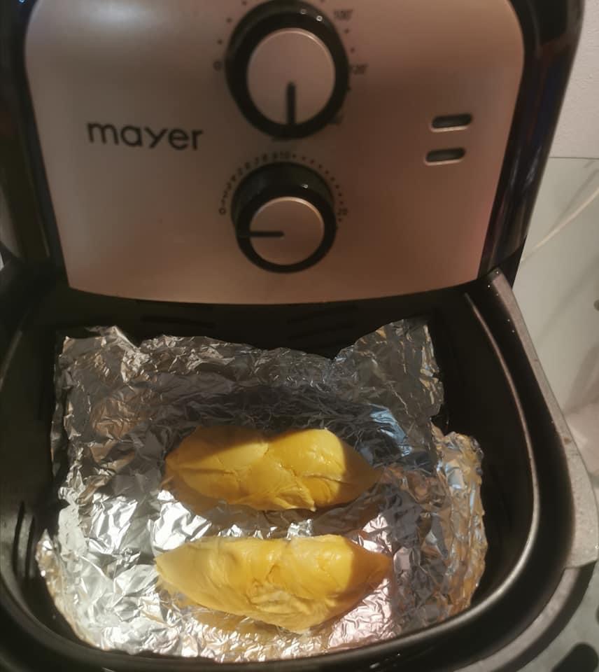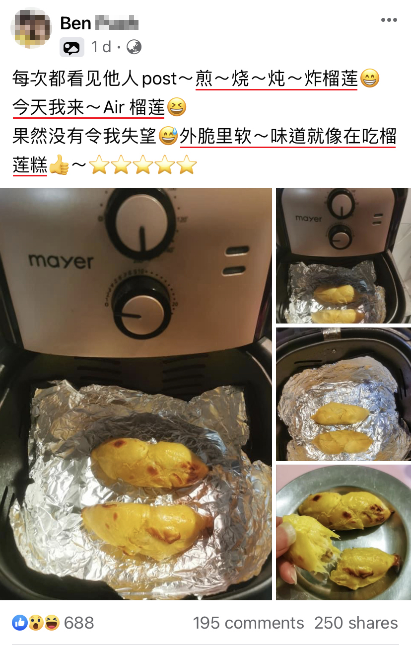 一名大马网友近日在脸书群组“吃的平台”分享榴莲的另类吃法,用气炸锅烤榴莲!网友们尝试以后都赞不绝口哦!