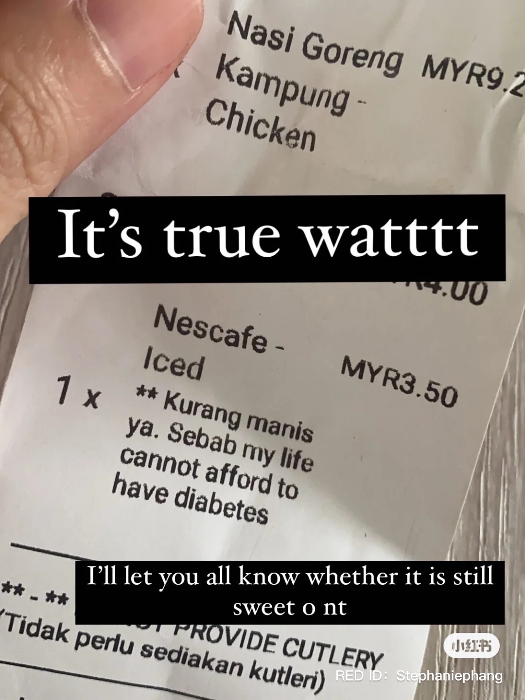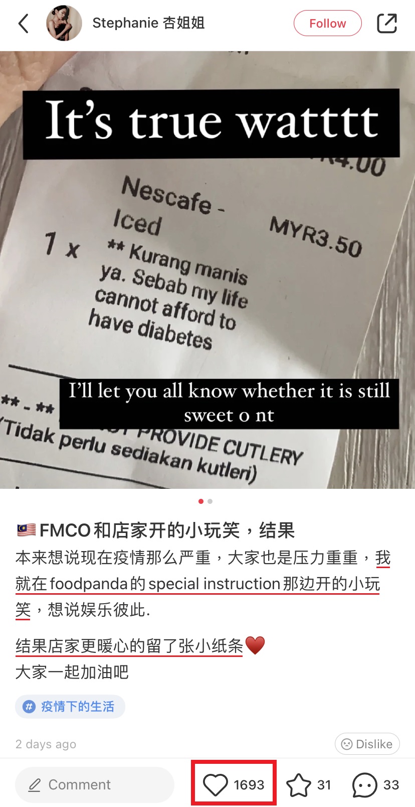 ▼ 贴主通过 Foodpanda 点外卖,订单中包括一杯冰的 Nescafe,她带着开玩笑的语气备注写道:「我要少糖哦!因为我的生活已经负担不起患糖尿病的医药费。」
