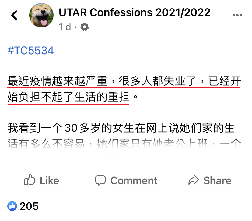 我看到一个30多岁的女生在网上说她们家的生活有多么不容易,她们家只有她老公上班,一个月大概RM3000多。家里有4个小孩,最大的那个8岁,最小的2岁,每天都是吃酱油拌饭,家里的小孩每天都吃不饱,她很心疼她们家的小孩。