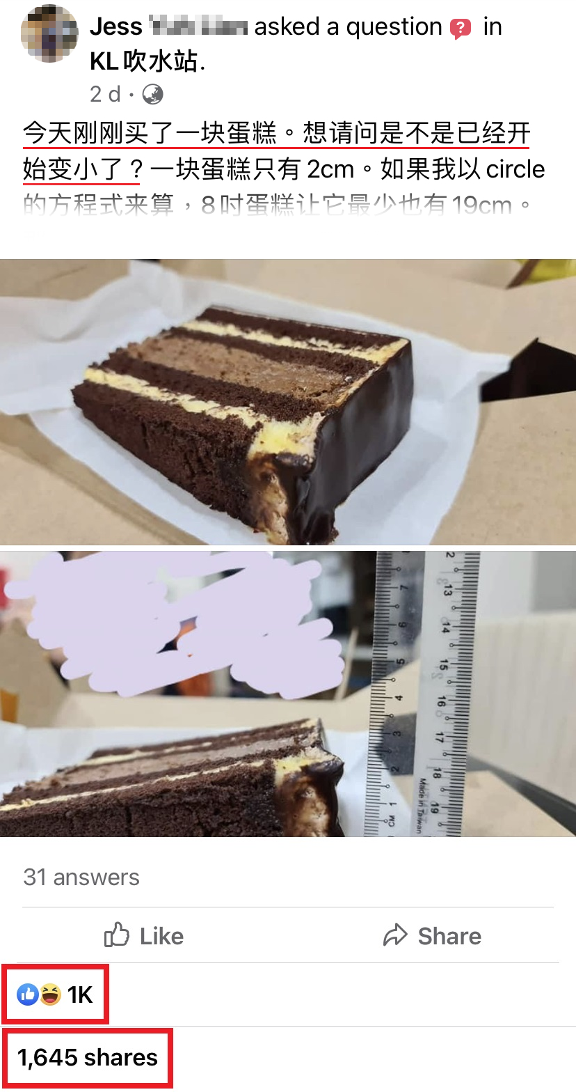 一名大马网友在著名连锁餐厅购买了他们家的招牌蛋糕,结果发现蛋糕好像比以前小了?为了证明这件事,她用精准的数学方程式算了一遍然后做出了总结。网友们看了都表示佩服啊~