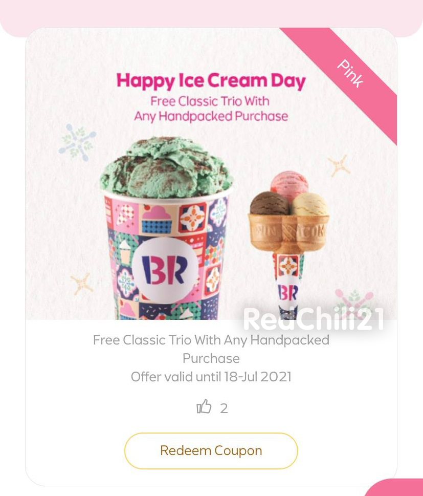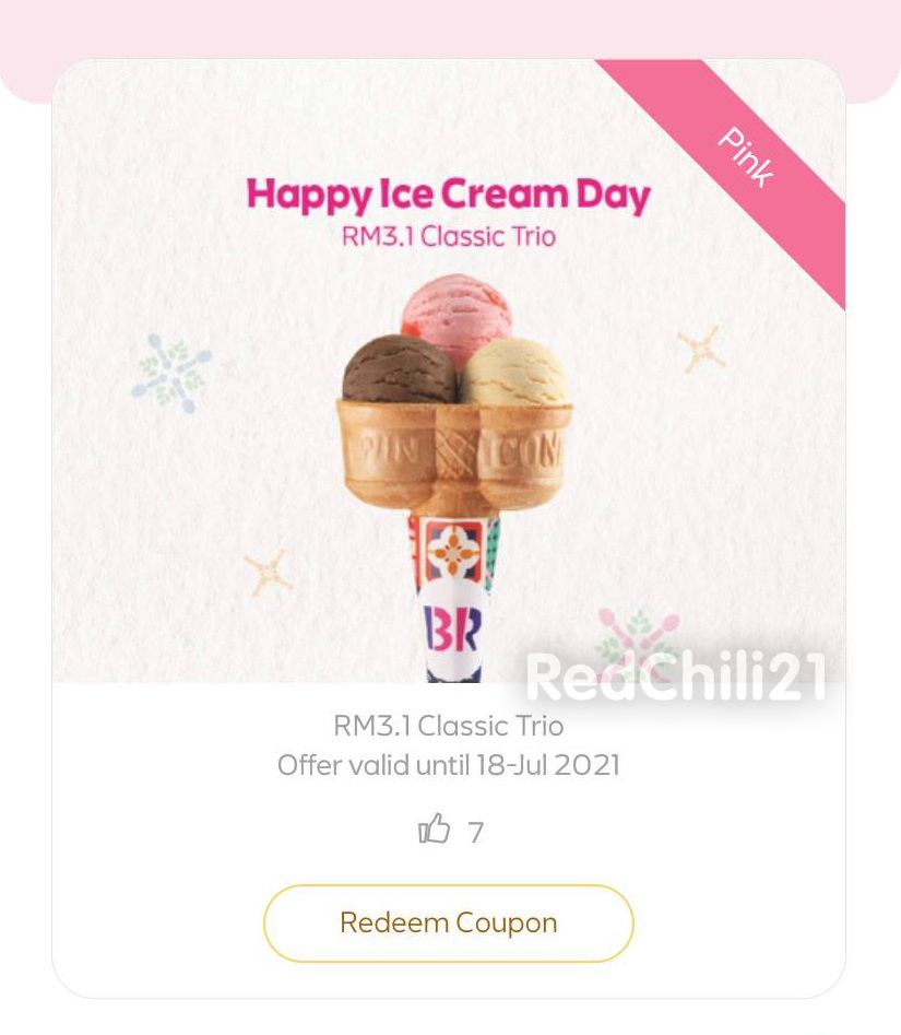 需要注意的是,当你前往Baskin Robbins 分店时,需出示Baskin Robbin App 里的优惠券给工作人员扫描二维码才可获得此优惠(必须是Baskin Robbins 会员哦)!