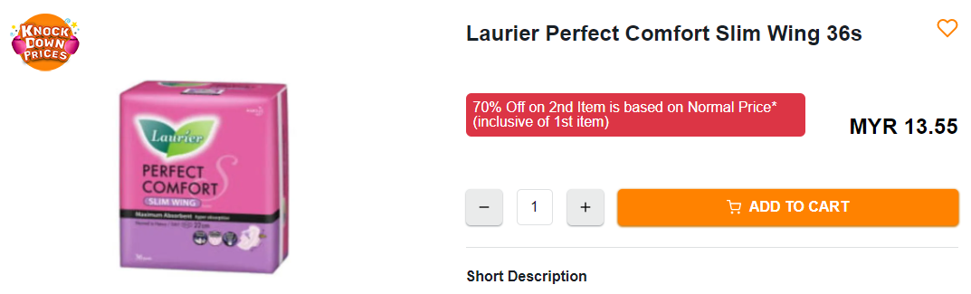 ※ 图中所显示是1样商品的价钱!(2包卫生巾 – RM13.36;平均一包只需RM6.68)