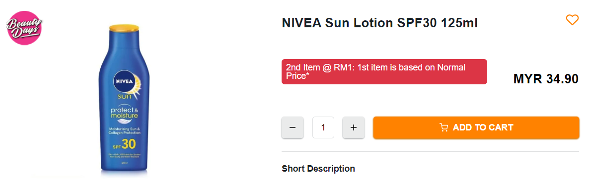 ※ 图中所显示是1样商品的价钱!(2瓶Nivea 防晒 – RM35.90;平均一瓶只需RM17.95)
