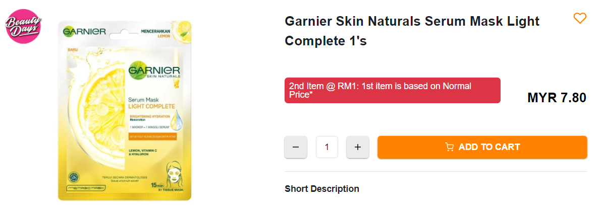 ▼ Promotion 7:Garnier Skin Naturals Serum Mask Light Complete 1’s;购买【点击这里】