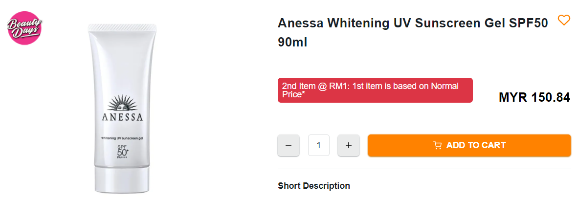 ※ 图中所显示是1样商品的价钱!(2瓶Anessa 防晒 – RM151.84;平均一瓶只需RM75.92)