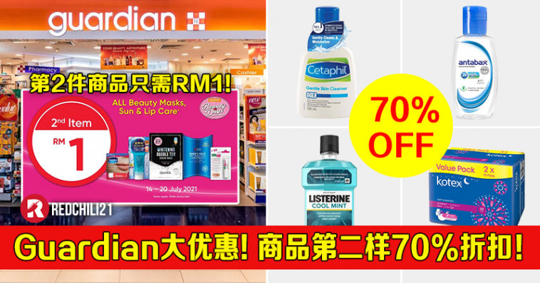 促销活动:Guardian 商品大优惠!第二样只需RM1 及70%折扣!