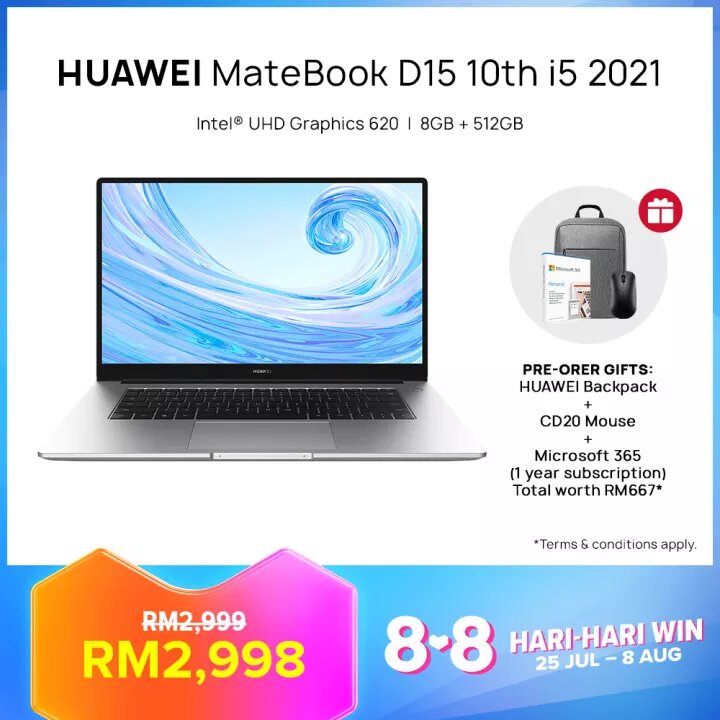 ▼ HUAWEI MateBook D15 10th i5 2021 Laptop | 8GB + 512GB – 只需RM2998(原价RM2999)