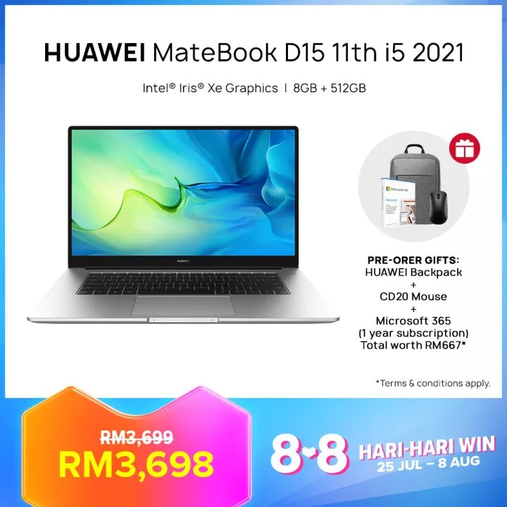 ▼ HUAWEI Matebook D15 11th i5 2021 Laptop | 8GB + 512GB – 只需RM3698(原价RM3699)