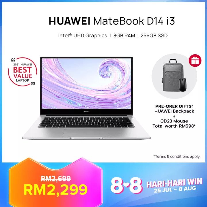 ▼ HUAWEI MateBook D14 i3 Laptop | 8GB + 256GB – 只需RM2299(原价RM2699)