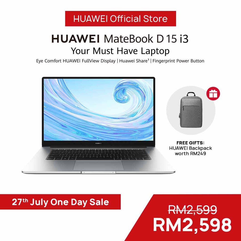 ▼ HUAWEI MateBook D15 10th i3 2021 | 8GB + 256GB SSD – RM2598(原价RM2599)