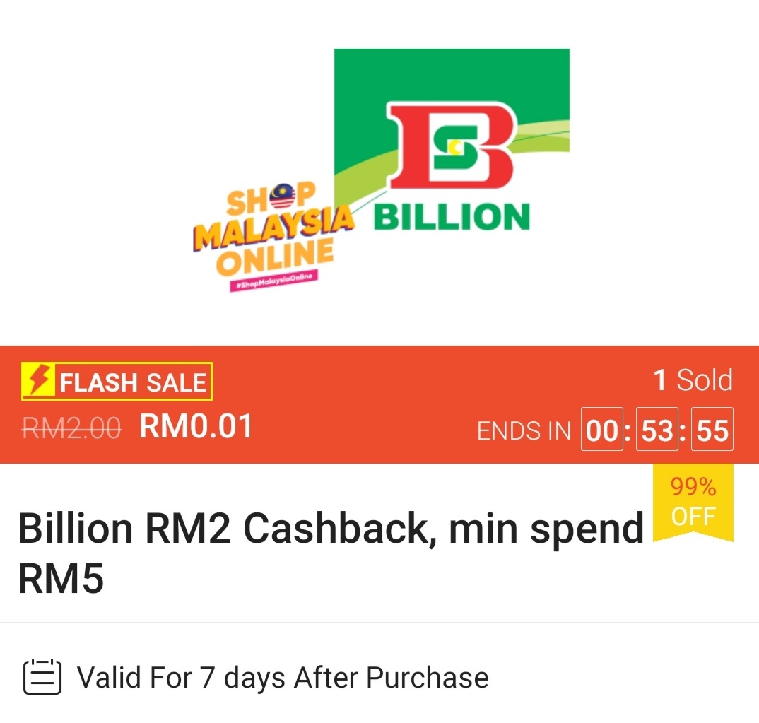 ▼⑦ Billion – 消费RM5 可获得RM2 现金回扣;购买【点击这里】