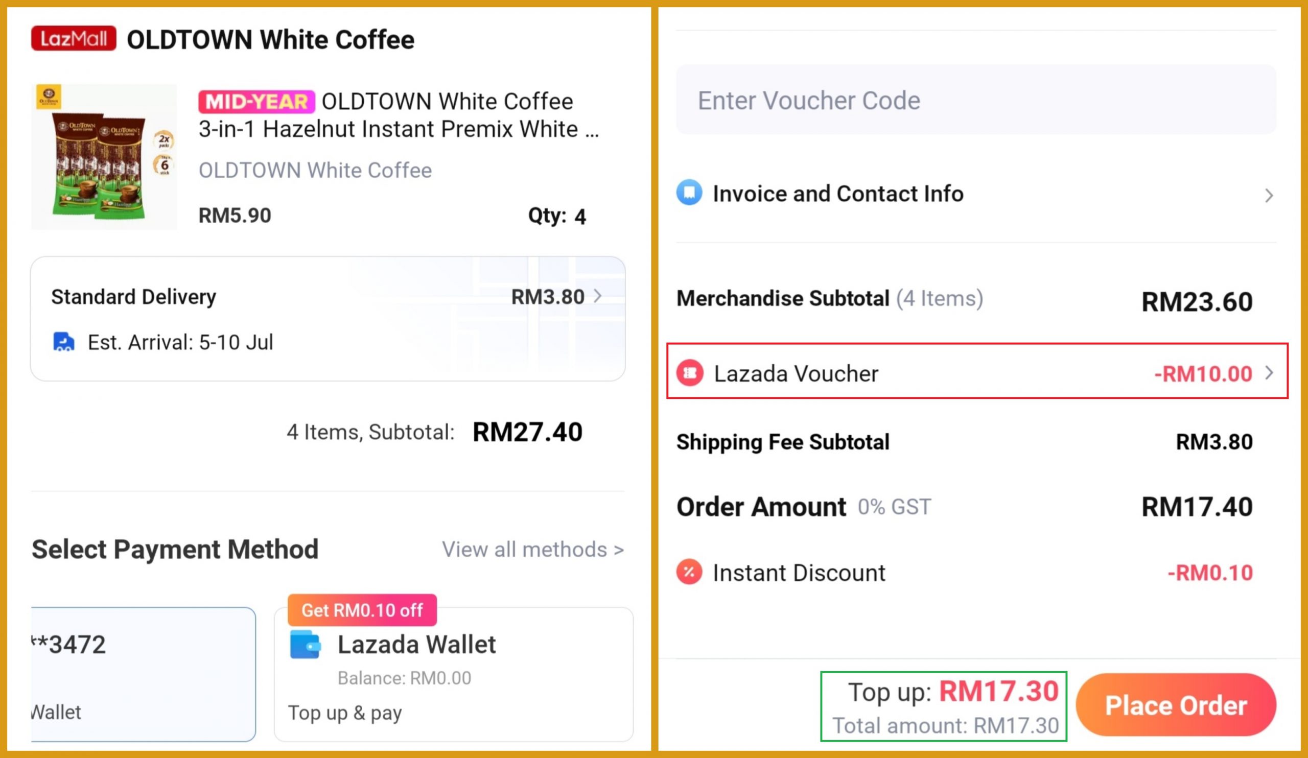 步骤4:4包(共24条)Oldtown 白咖啡(原价RM27.40)折扣RM10优惠券 ,只需RM17.30!平均一条只需RM0.72!