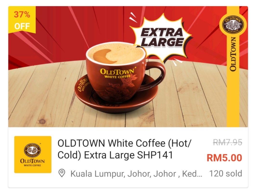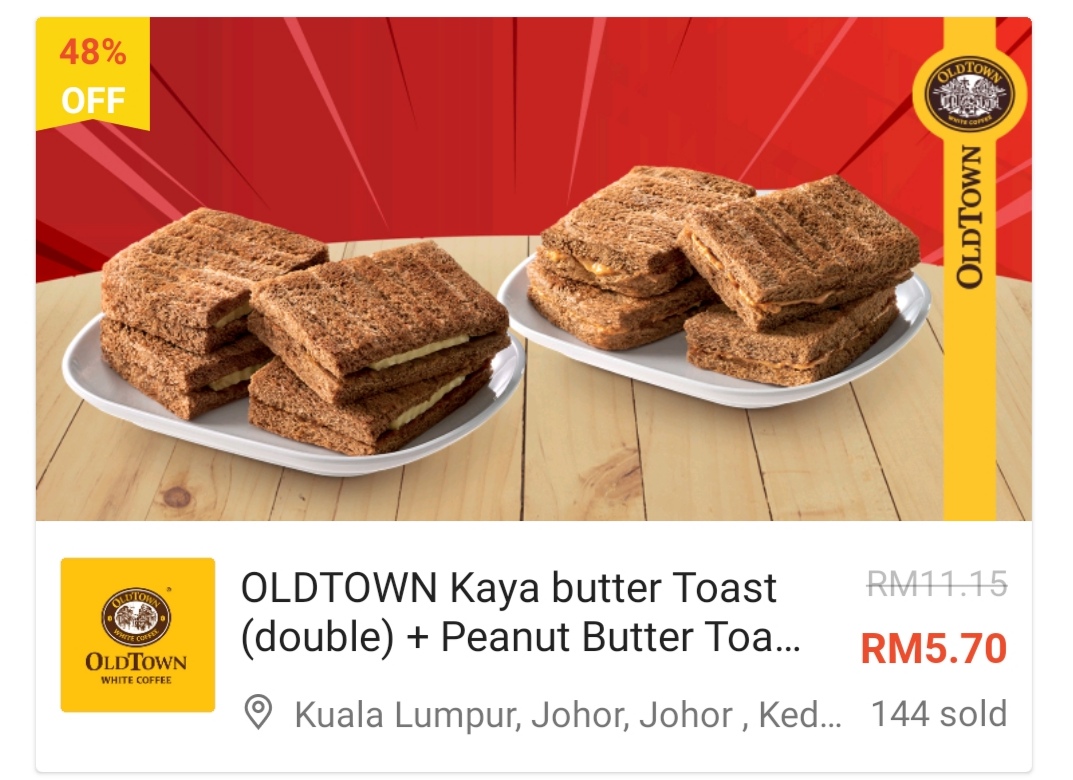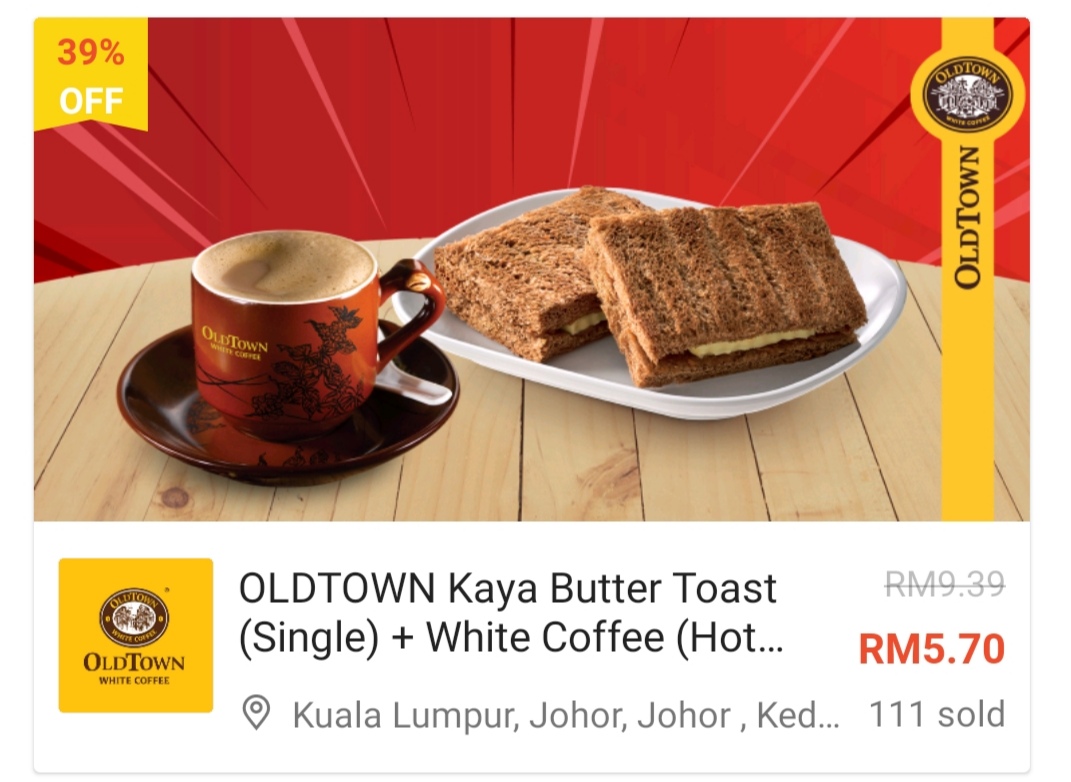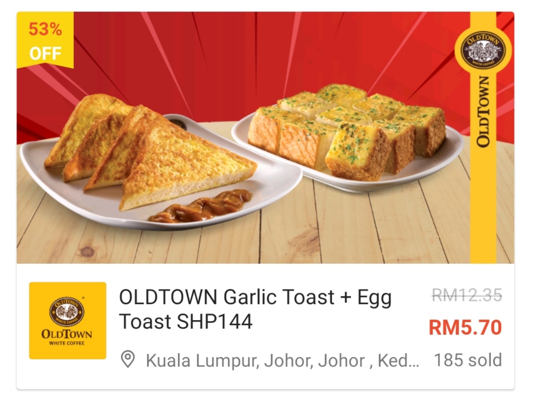 这项优惠是由Oldtown 与Shopee 联合推出美食优惠券!招牌吐司+白咖啡套餐只需RM5.70、面类及饭类餐点最低只需RM7.70!