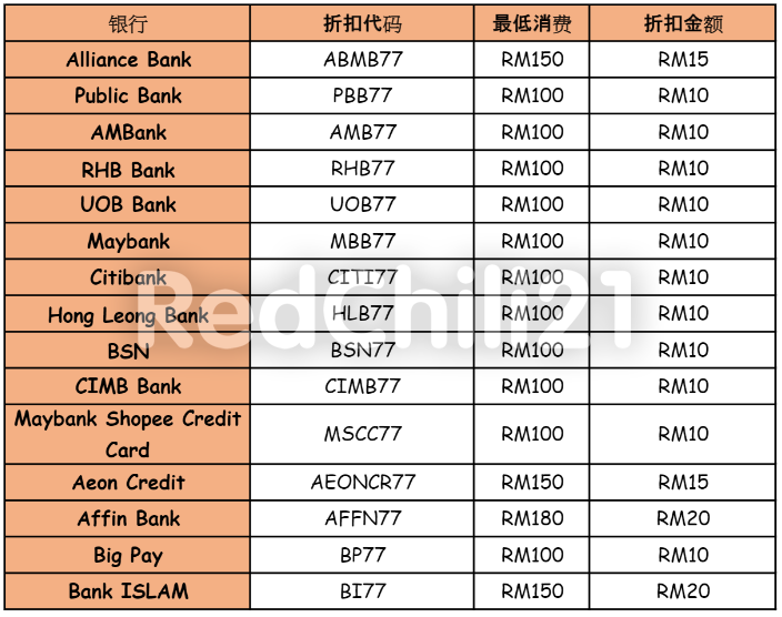 1)Alliance Bank —— 消费RM150,可折扣RM15