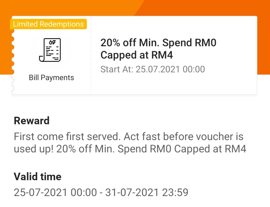 ▼ i)缴付账单可获得20%折扣(高达RM4折扣);优惠代码【BILLSJULY21】