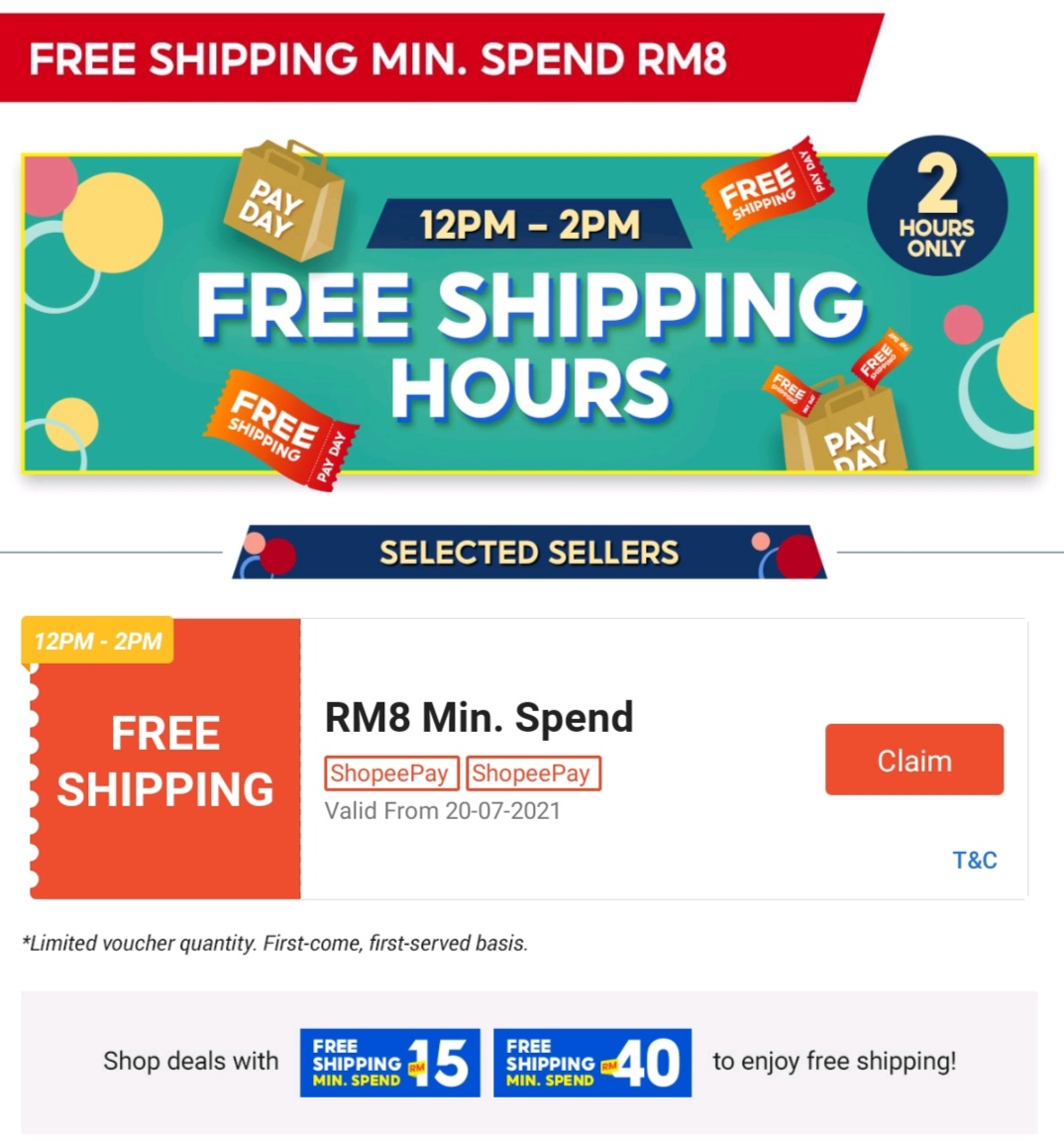 i)当天12pm 至2pm 可享有无限最低消费免邮券!此优惠限于指定商家及Shopee Mall 商家!