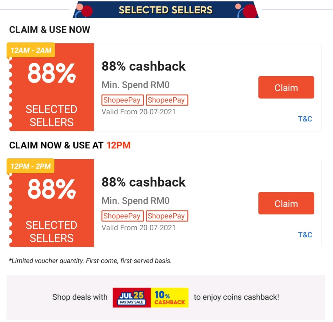Shopee 用户可在7月20日当天享有最低RM8 免邮券、88%现金回扣券,以及领取高达800Coins!