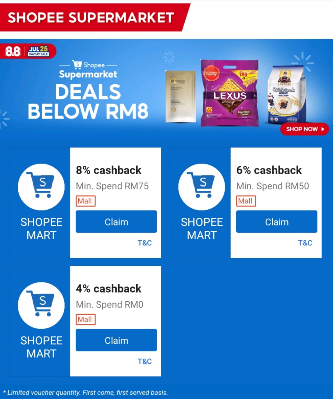 Shopee Mart 折扣全优惠,最高可享有8%回扣!记得去领取啦!
