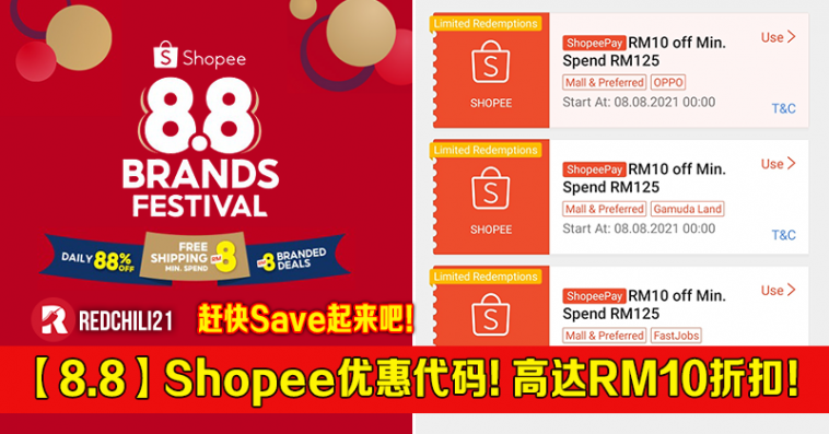 Shopee【8.8】品牌促销日这天特别推出折扣券给大家,高达RM10 折扣!赶紧把这些优惠代码Save 起来吧!