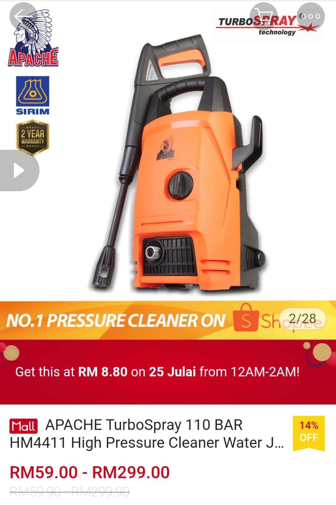 ▪ APACHE TurboSpray 110 BAR HM4411 High Pressure Cleaner Water Jet Water Sprayer Car Wash – RM59.90 – RM299.90 RM8.80