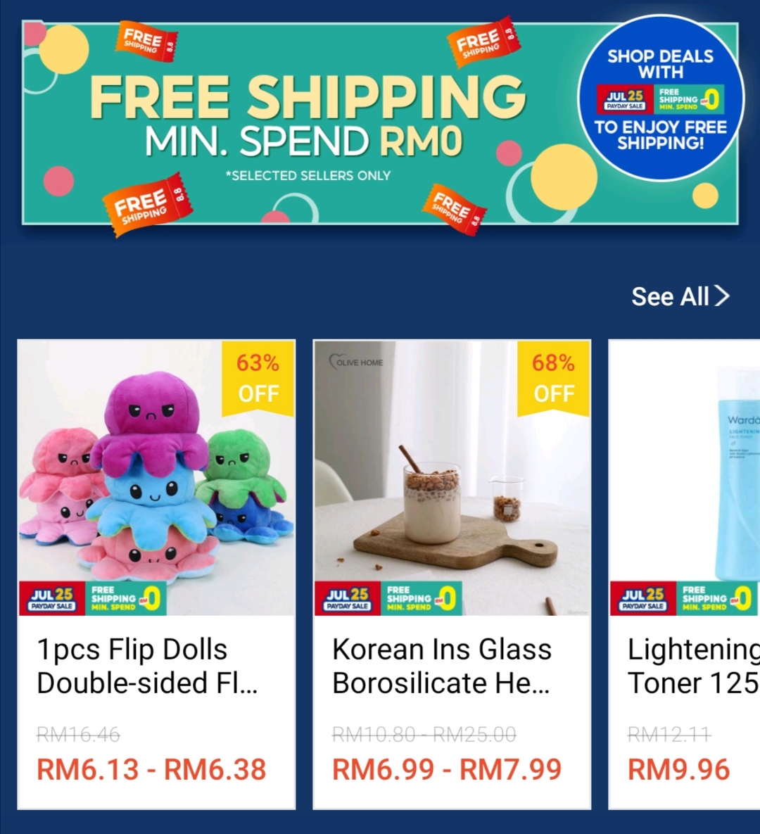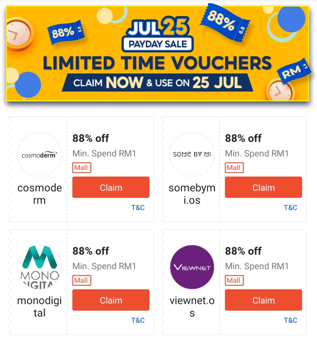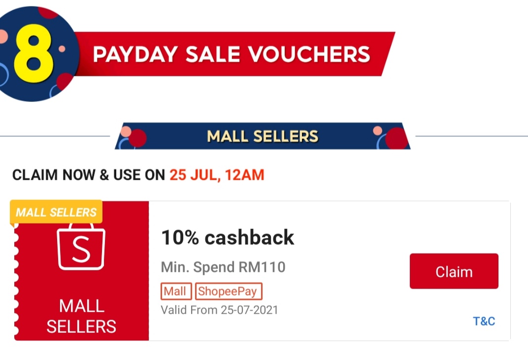Shopee 将在7月25日举办【PayDay Sale】促销活动!Shopee 用户可在7月25日当天享有最低RM8 免邮券、88%现金回扣券,以及享有最低RM8 品牌商品优惠!