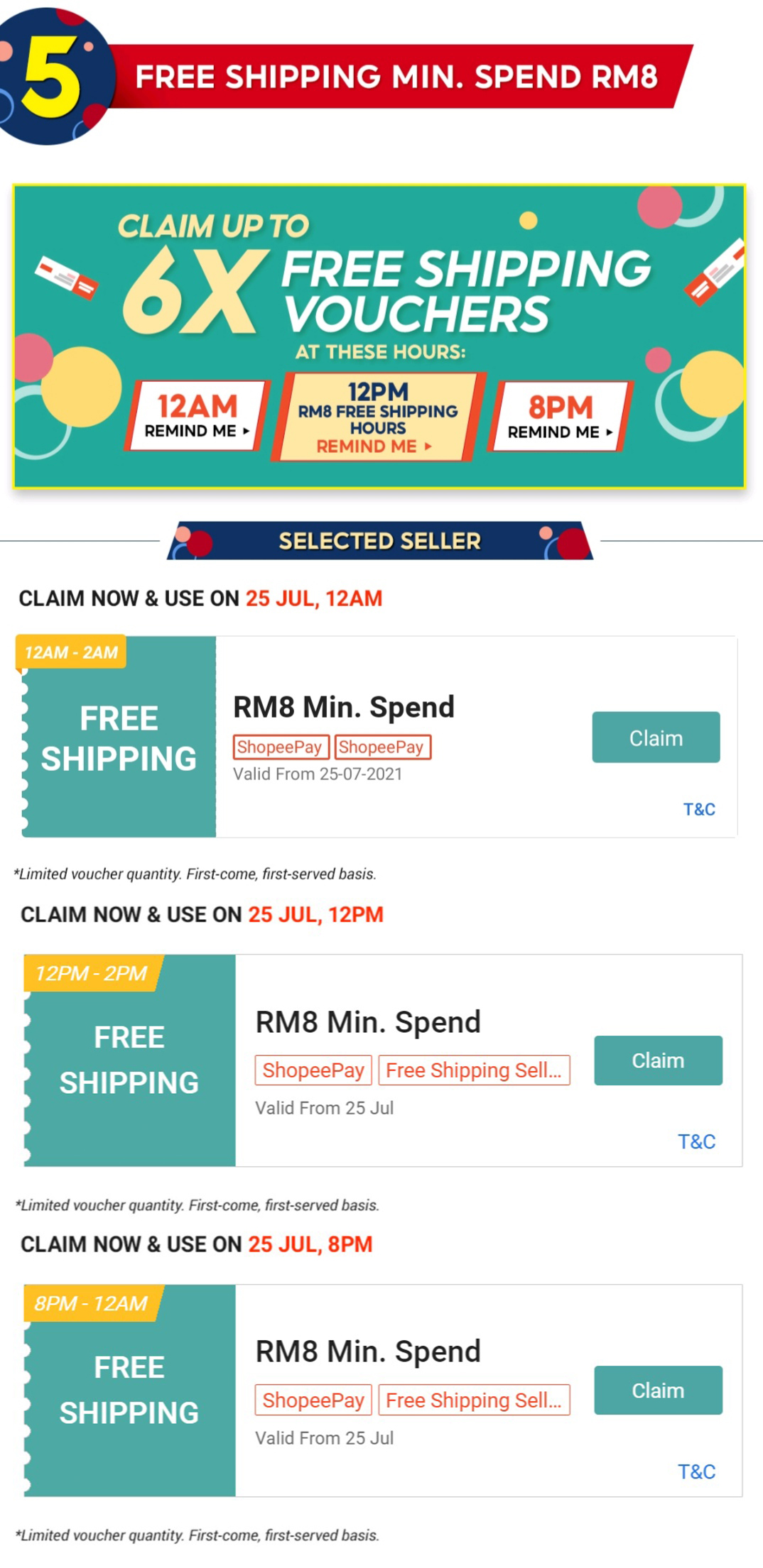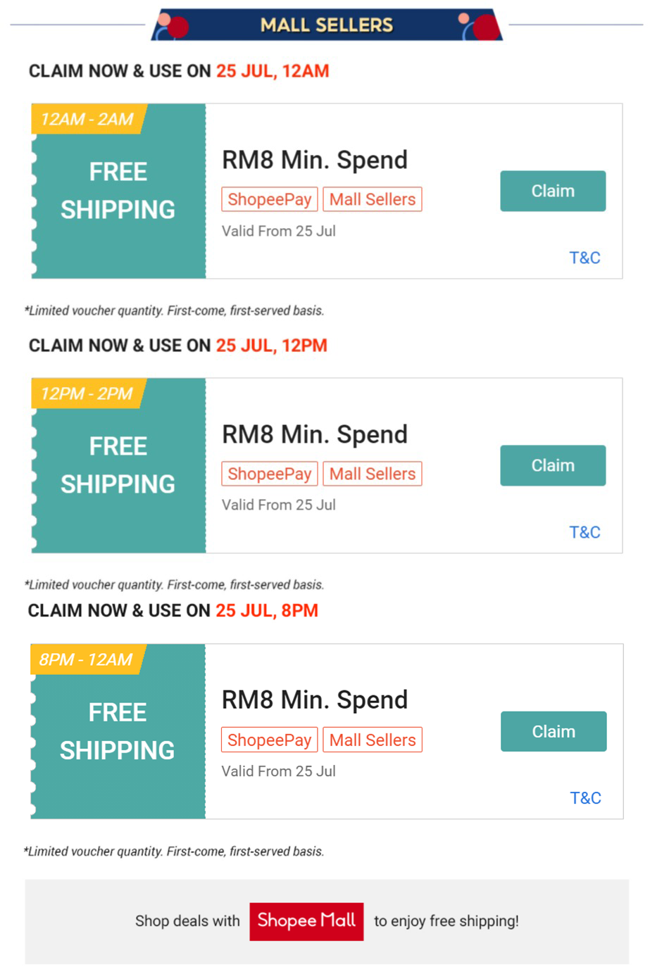 i)将在3个时段:12am、12pm 和8pm 发放6张免邮券!分别是3张(指定商家)免邮券和3张Shopee Mall 免邮券!