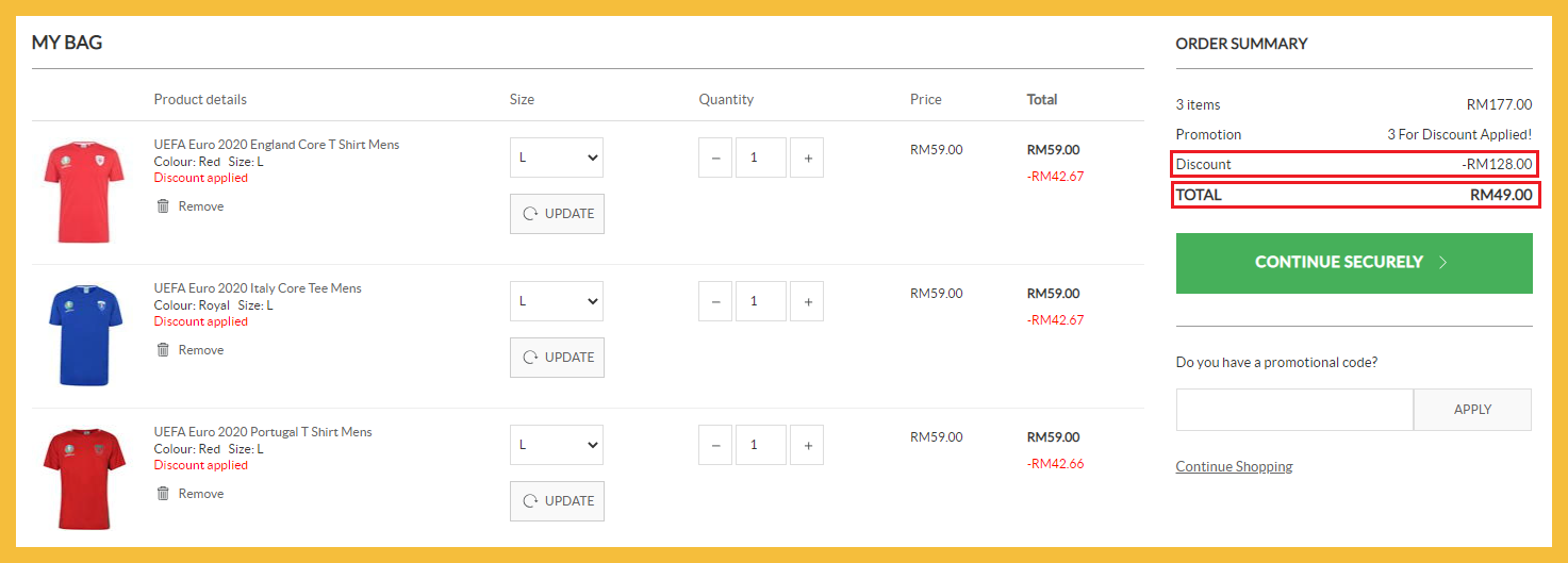 这项优惠是由SportsDirect 官网推出Euro Tee 大促销,1件只需RM29!倘若你购买3件就可享有RM49 特别优惠价!相等于一件只需RM16.33!