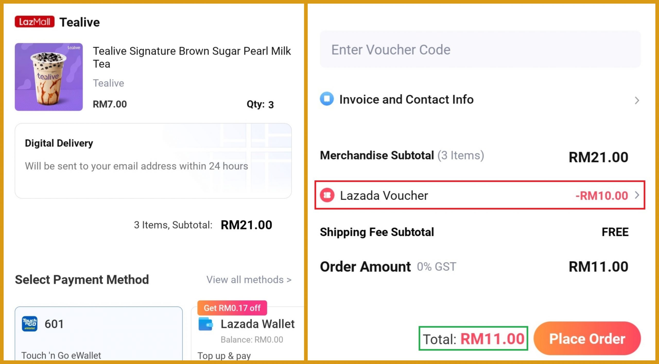 ① 打开Lazada App 领取Tealive 50% 折扣券;领取【点击这里
