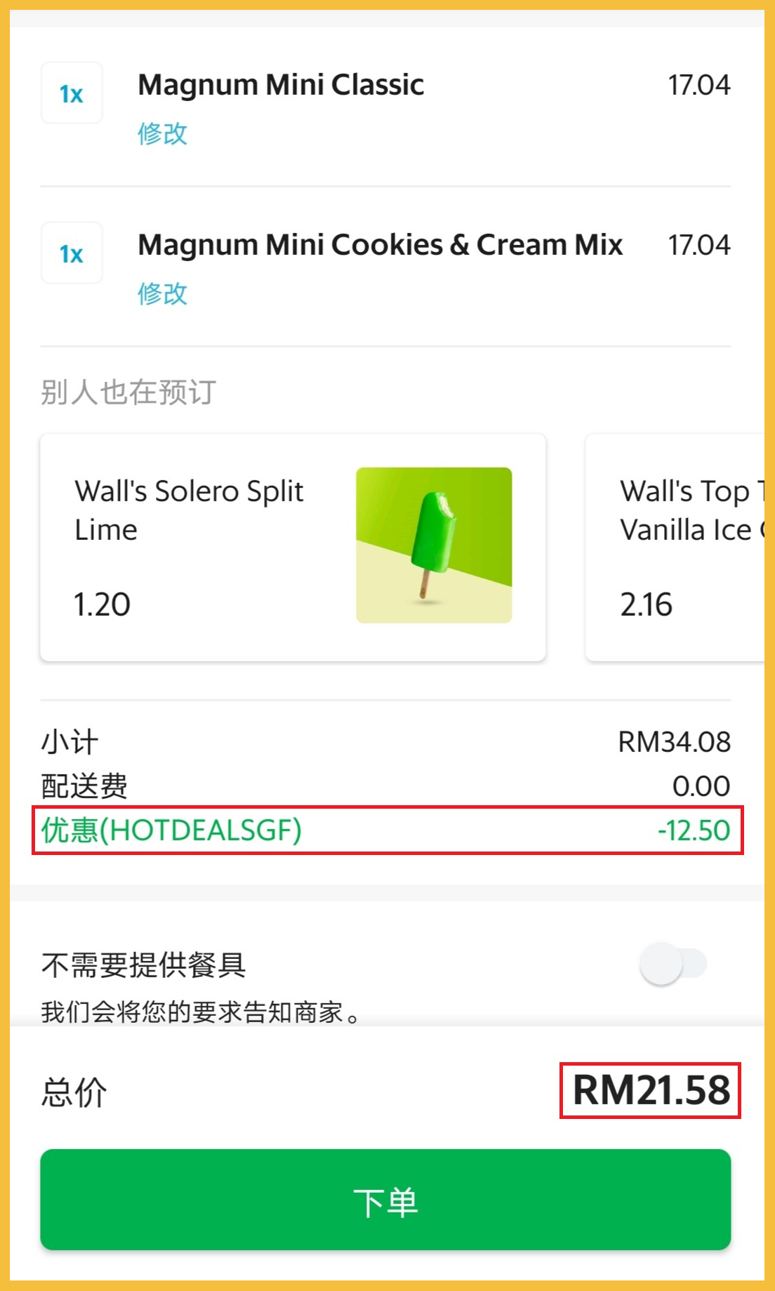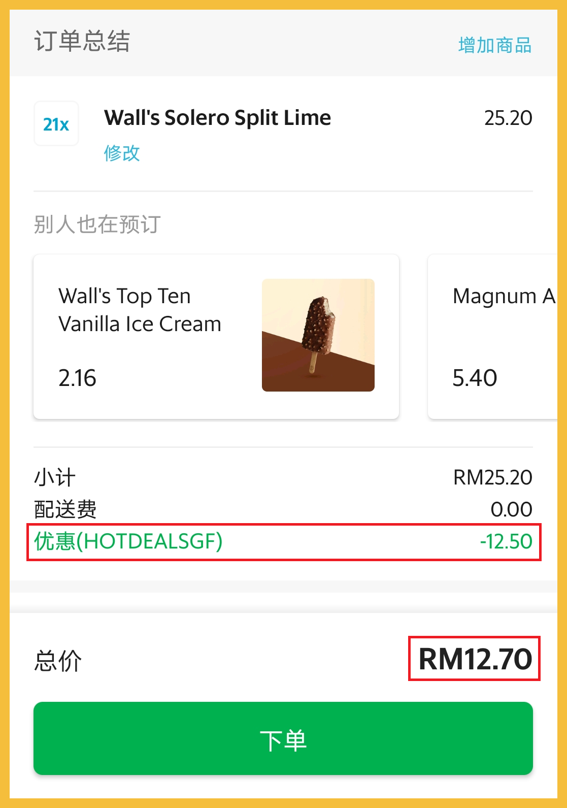 ▼ 2盒Magnum Mini 冰淇淋原价RM34.08,折扣RM12.50【HOTDEALSGF】后,只需RM21.58!平均一盒RM10.79,也是值得买哦!