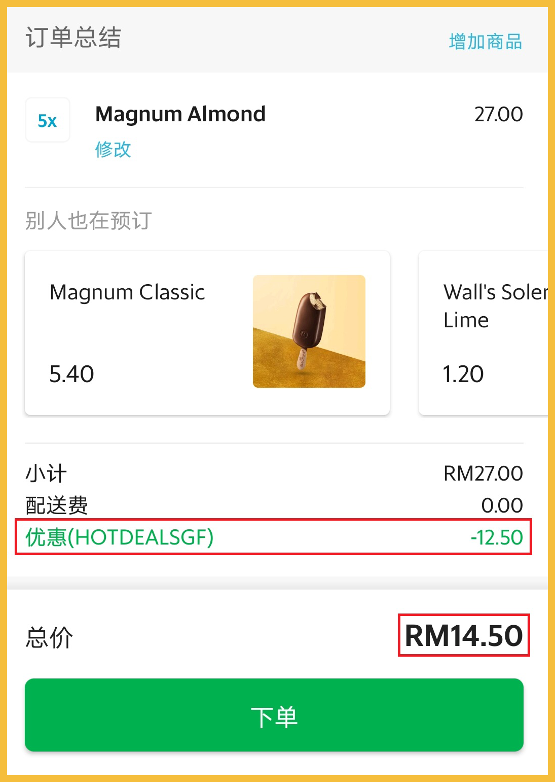 促销活动:使用GrabFood 购买Wall’s 雪糕,可获得【HOTDEALSGF】50%折扣
