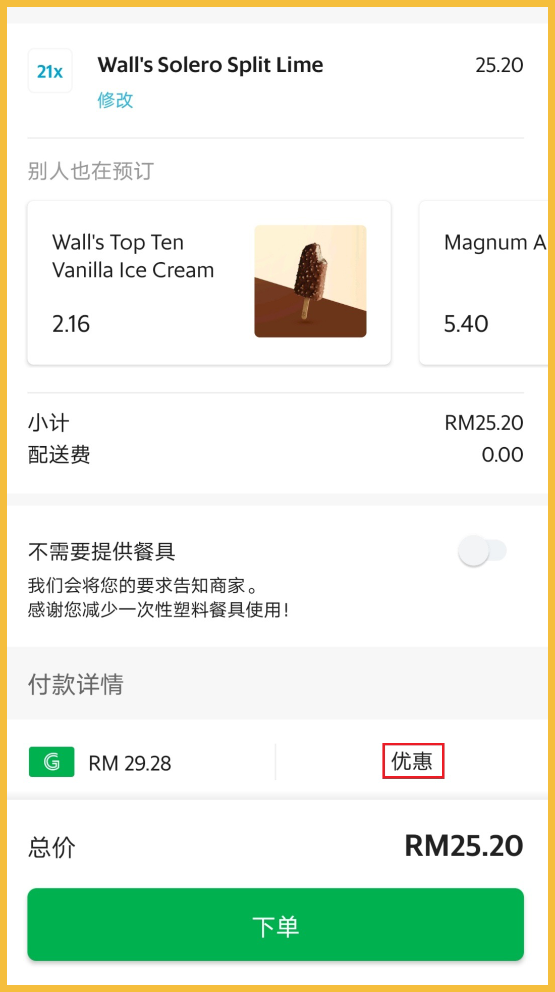 ※ 注意,最低消费RM25,才可获50%折扣(高达RM12.50)!所以小编购买21支Splite Lime 冰淇淋!