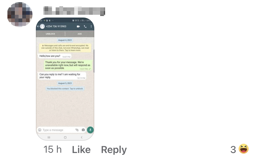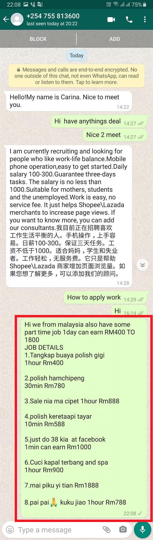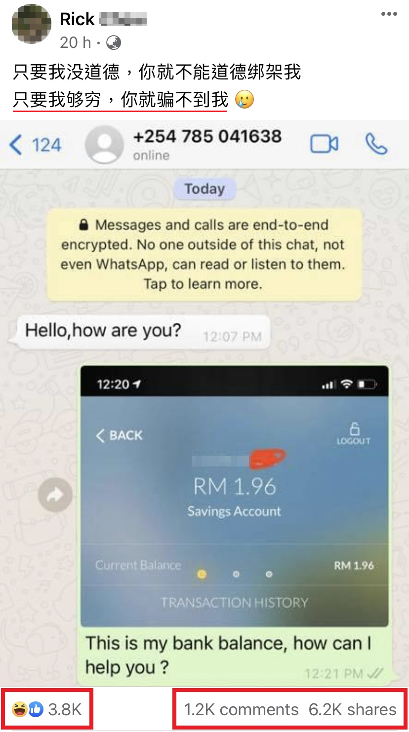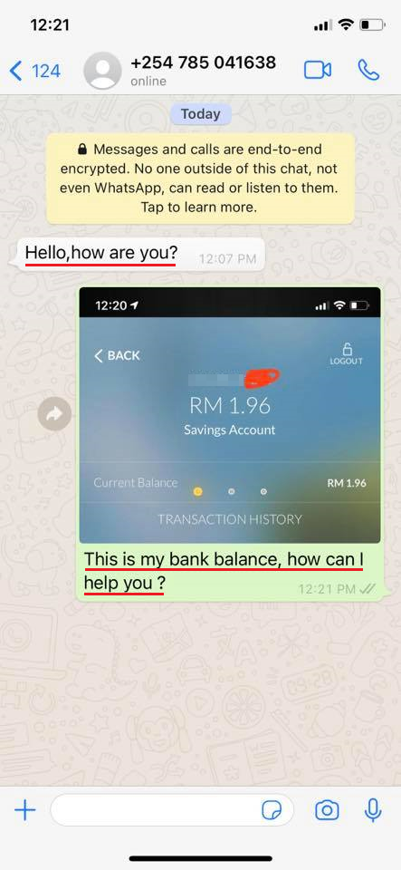 ▼ WhatsApp 突然收到一封信息来自外国的陌生号码:「哈喽,您好吗?」事主二话不说,直接把银行户口的存款截图下来,然后分享给对方看,而且还带着非常真诚的语气写道:「这是我的银行存款,我能怎样帮助您吗?」后来就再也没有收到对方的回复了…