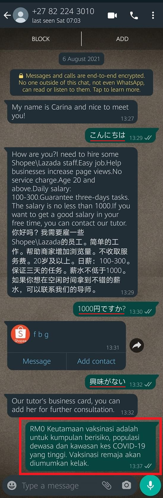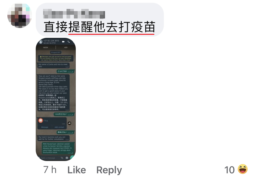 ▼ 温馨提醒:记得打疫苗哦!(直接把 MKN 的信息 copy paste 给他。)