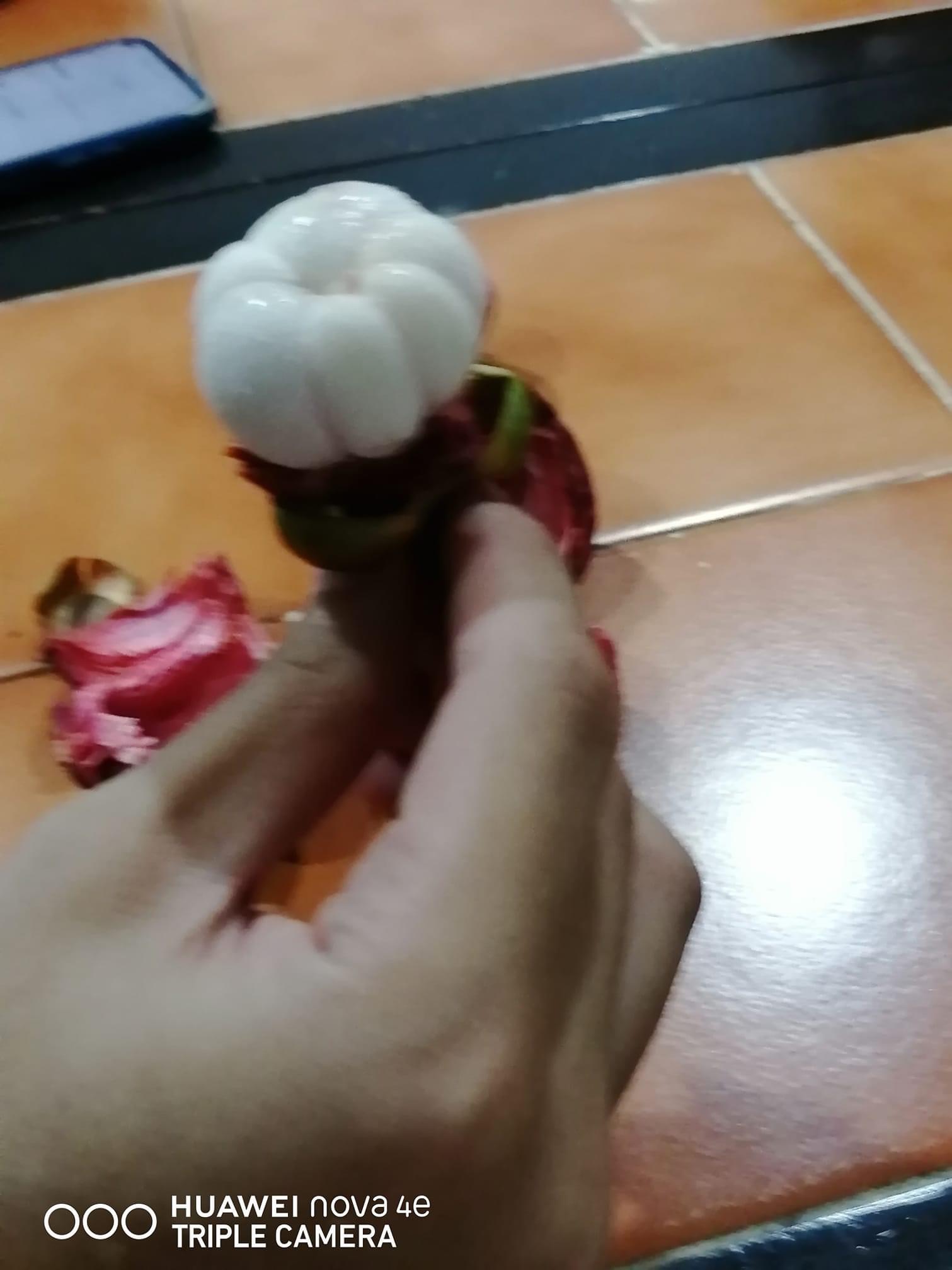 ▼ Step 2:然后双手轻轻地挤压,山竹的外壳就裂为两半掰开了。