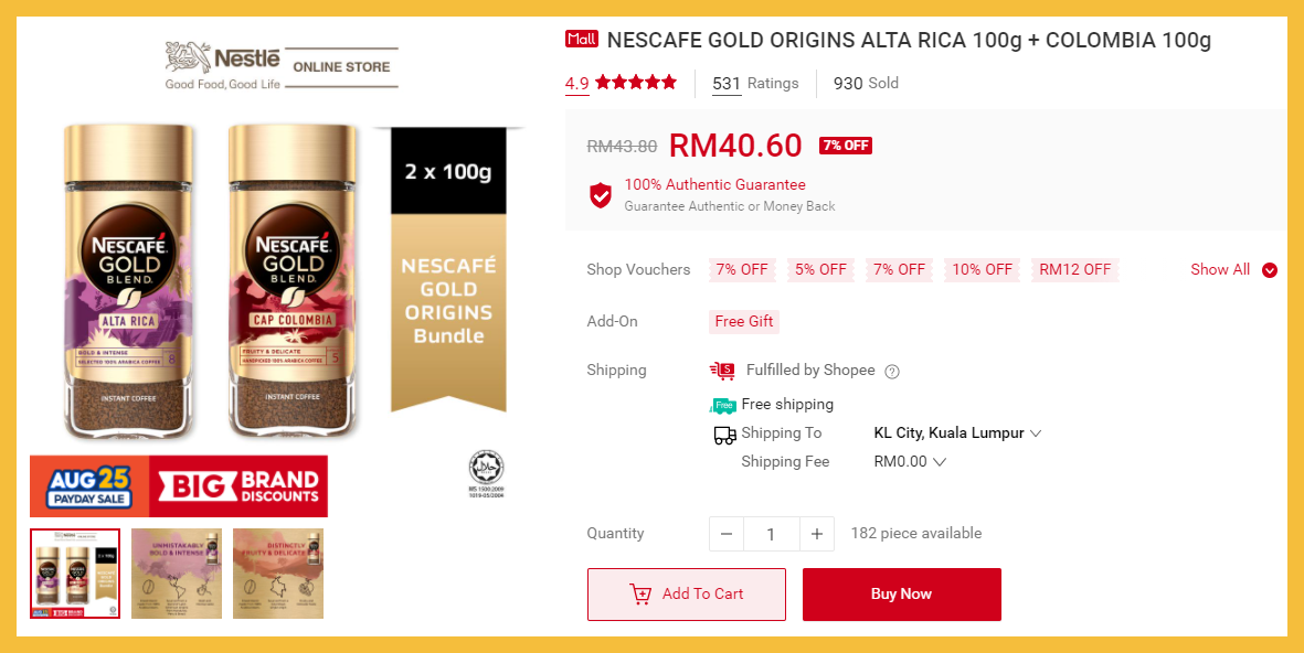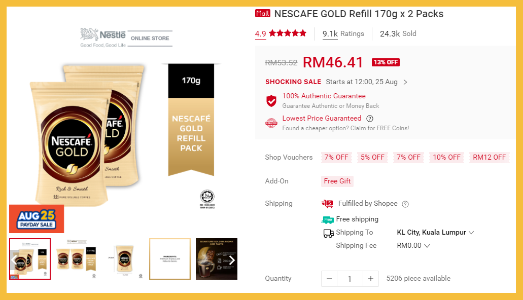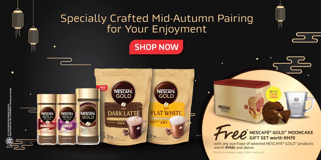 这项优惠是由Shopee Nescafe 官网推出活动优惠!只要你购买NESCAFE GOLD 咖啡,就可免费获得Nescafe Gold 中秋月饼礼盒+玻璃杯(价值RM70)!