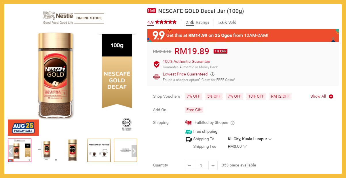 ▼ NESCAFE GOLD Decaf Jar (100g) – RM19.89;购买【点击这里】