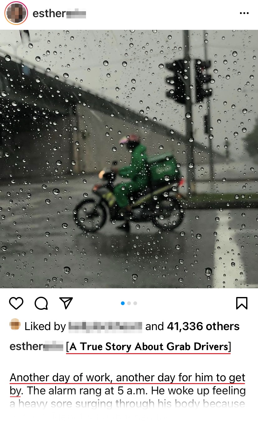 看完这个故事以后,你是不是好奇为什么我会知道这个故事?因为这位 Grab 送餐员就是我的父亲。他迟了2个小时才回到家和我们共度晚餐,他身上的衣服都湿了,他的皮肤被烫伤,他的眼睛是红肿的。