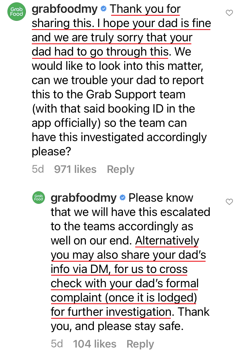 ▼ 该帖子引起广大网民的关注以后,GrabFood 公司就在评论区做出回应,并希望贴主提供详情给他们,以协助他们对这起事件展开进一步的调查。