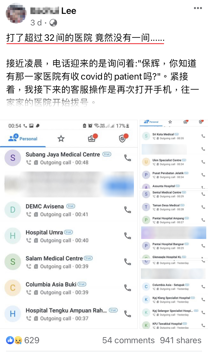 一名大马网友近日在脸书发长文,指他为了帮一位新冠病患寻找私人医院求医,联系了超过32家大大小小的医院,最后的结果让他心寒了:「若今天不是我自己本身亲身经历,我还真的不敢相信,其实马来西亚已经严重到这个地步!」