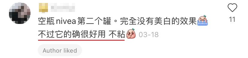 我终于找到平价又不粘的身体乳了!美白有没有效果就不确定啦,但使用感是好的,很水润、很容易抹开,涂上去皮肤滑滑的!还有一股淡淡的香味~