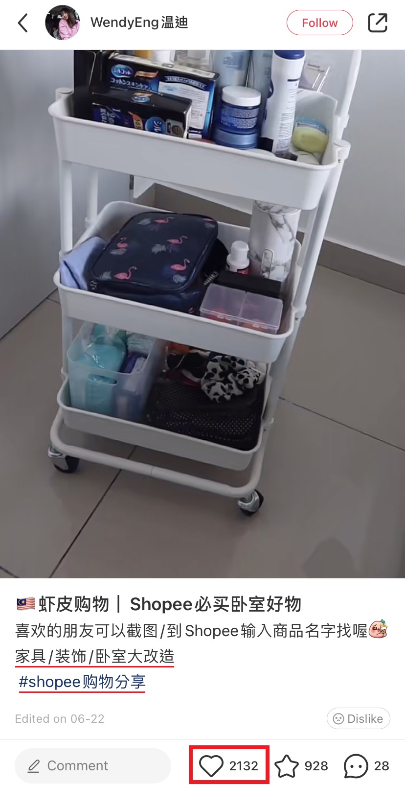 一名大马博主在小红书分享她种草的8个必买卧室好物,全都是在 Shopee 就买得到的哦!