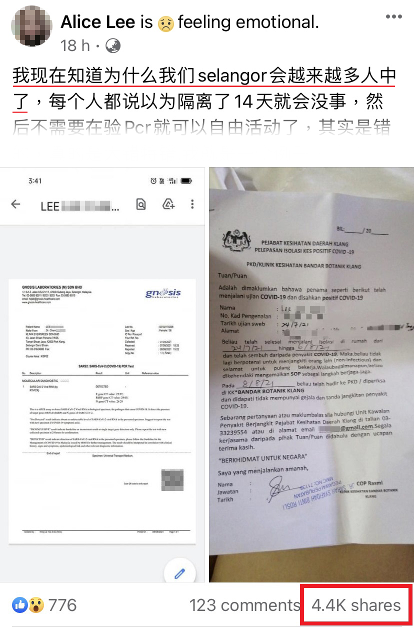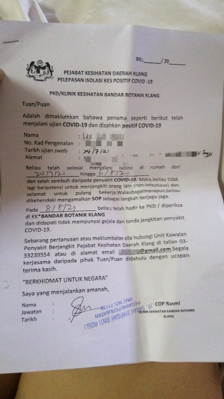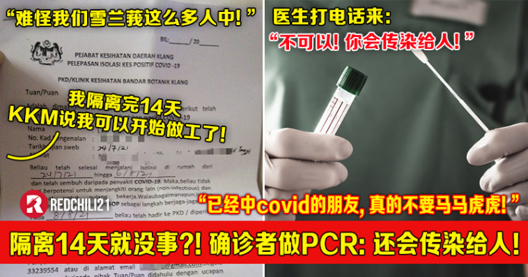 我就是一个例子,我从24/7/21隔离到今天8/8/21号已经是15天了,还真的天真以为自己真的没事了,不会传染了,还好是因为要工作的关系,所以我就去验一下 PCR 确保指数安全才工作。