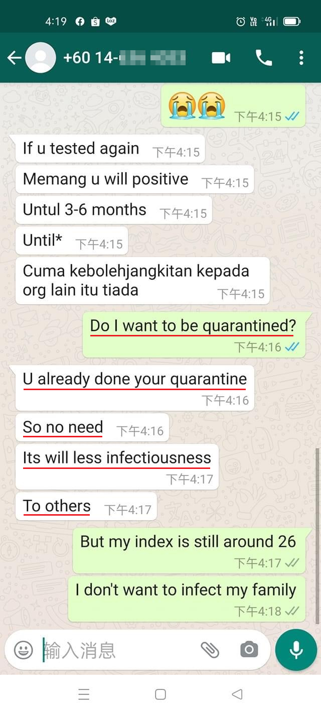 哪里知道今天才去拿 KKM 的纸,说我可以开始去工作了,刚刚就来医生电话说我的指数在26-29里面,这个指数是可以再次传染给人的,要隔离。