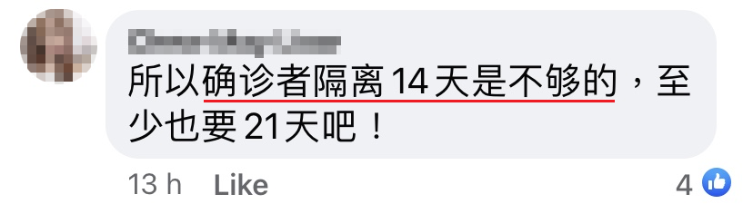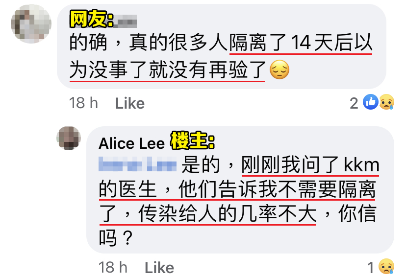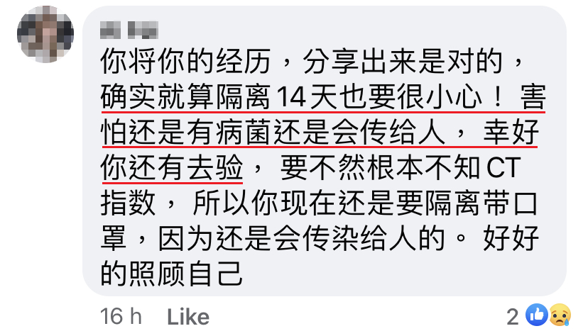 大马一位确诊病患就发文提醒,隔离14天以后建议再做一次 PCR 检查,因为体内的病毒很可能会传染给身边的人!