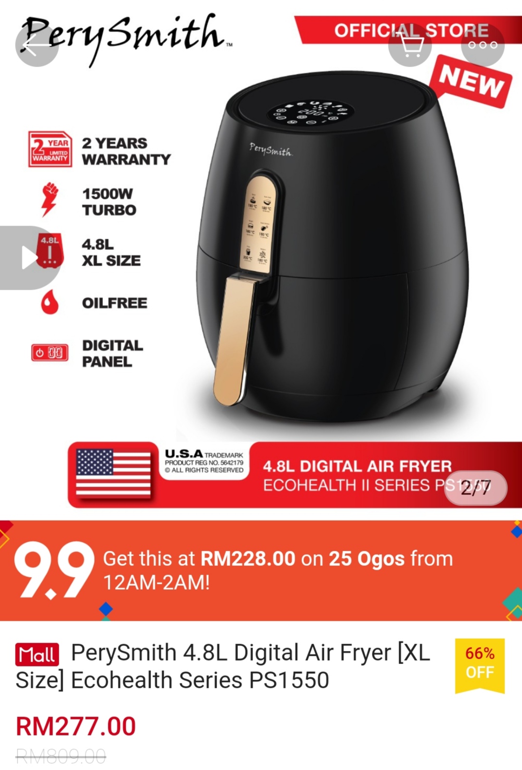 ② PerySmith 4.8L Digital Air Fryer [XL Size] Ecohealth Series PS1550