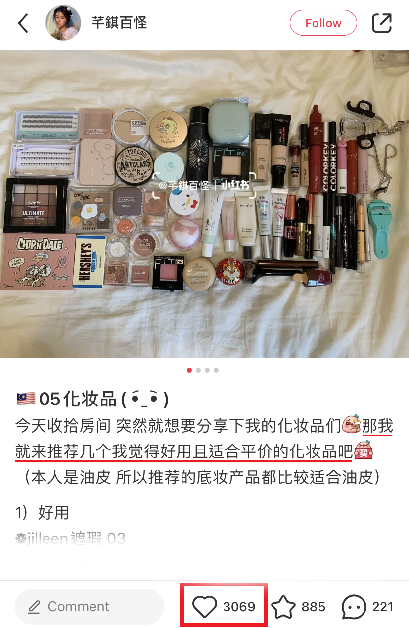 一名大马05后女生在小红书分享自己的化妆经验,多达23款的平价化妆品哪些好用哪些比较“达咩”,都一次过给你看完!