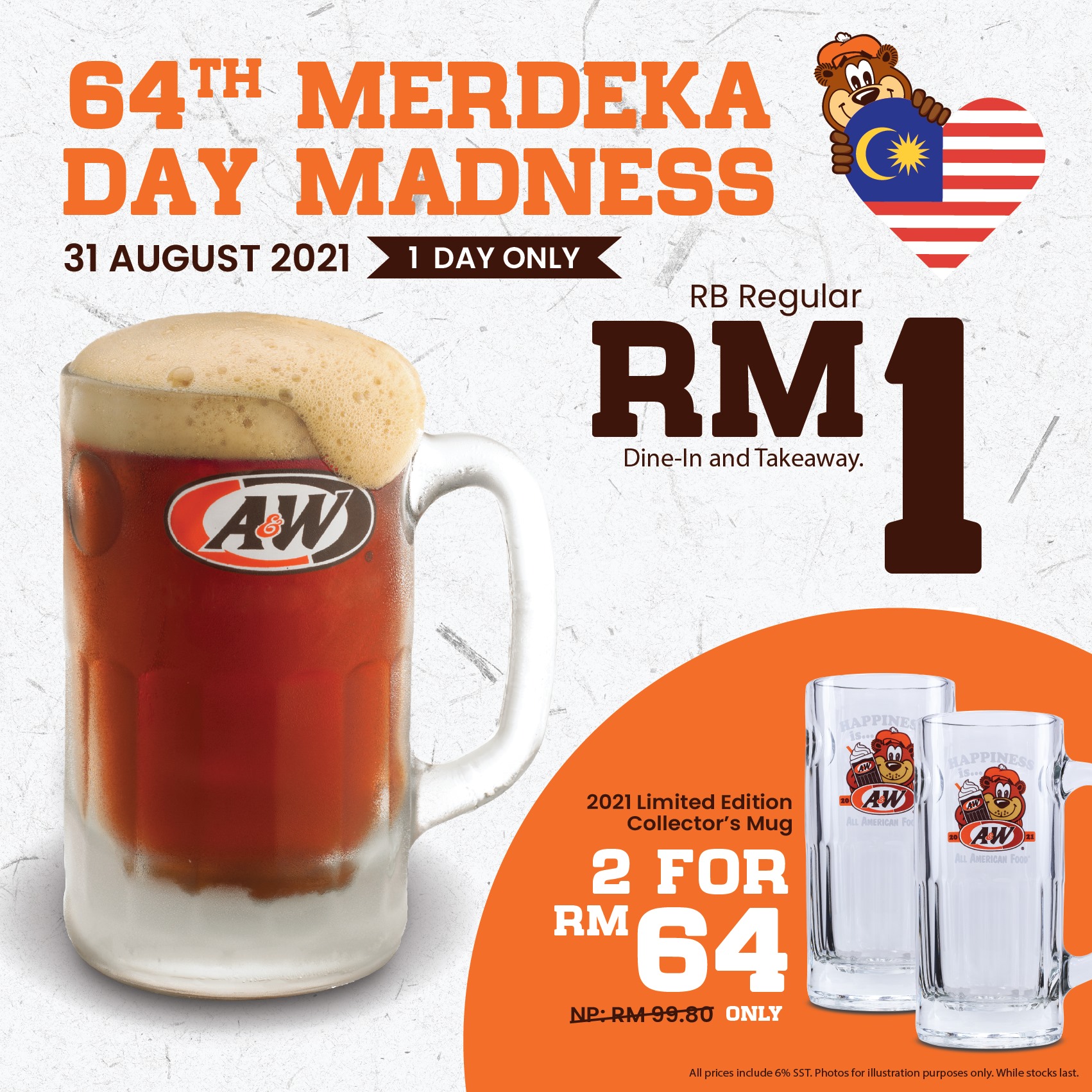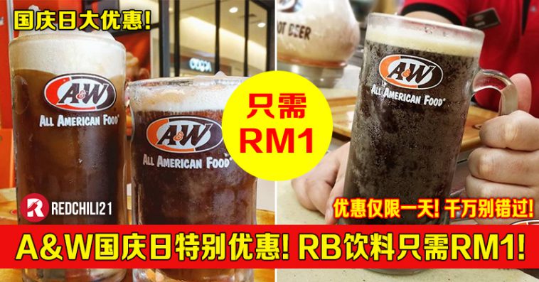 为了欢庆马来西亚64周年国庆日,大马A&W 推出RB 饮料只需RM1!优惠仅限8月31日一天!
