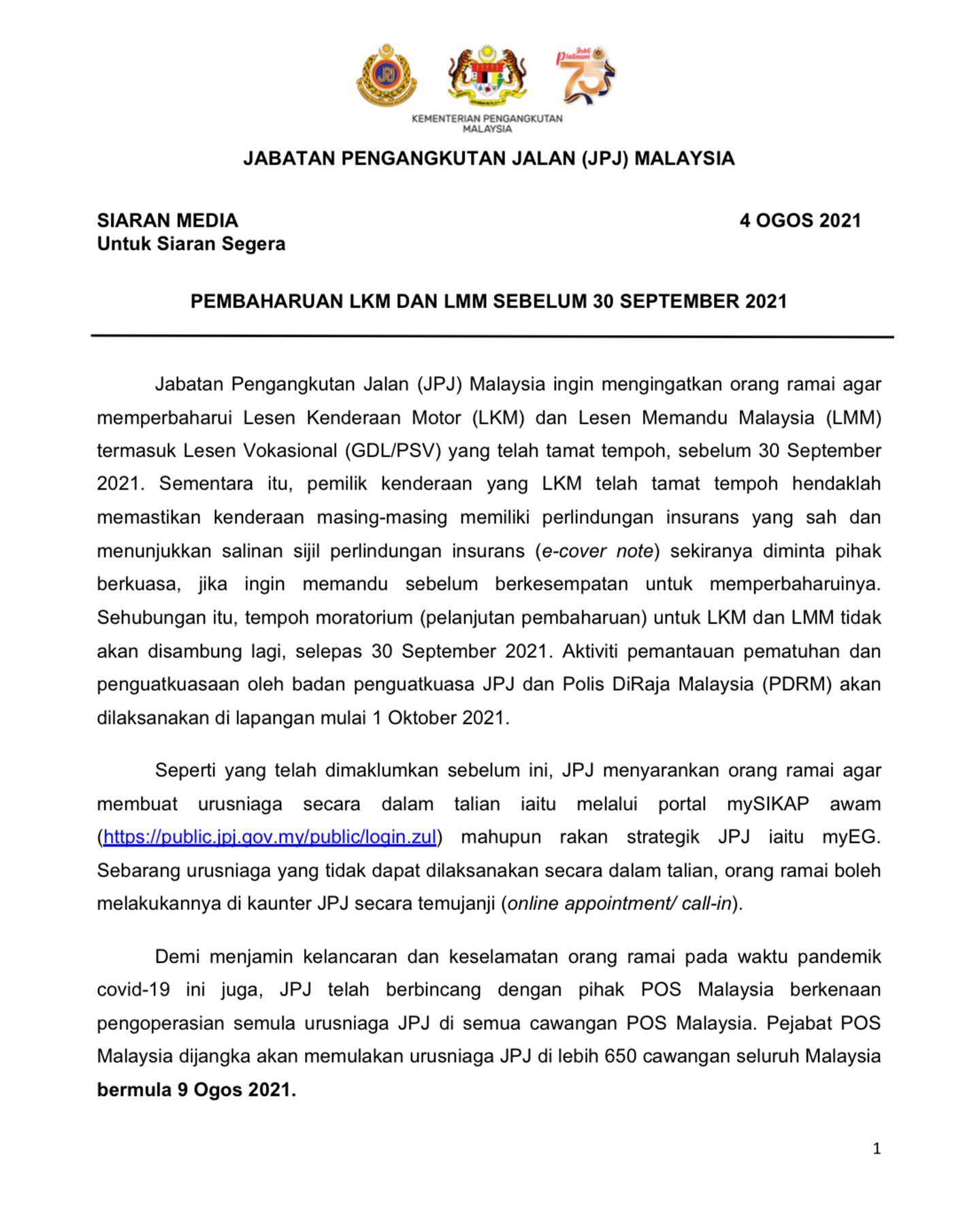 根据陆路交通局(JPJ)所发布的文告显示,持有过期驾照和路税的民众,都必须在9月30日前完成更新!包括车辆路税(LKM)、驾照(LMM)与商用车辆执照(PSV)和罗厘驾驶执照(GDL)!