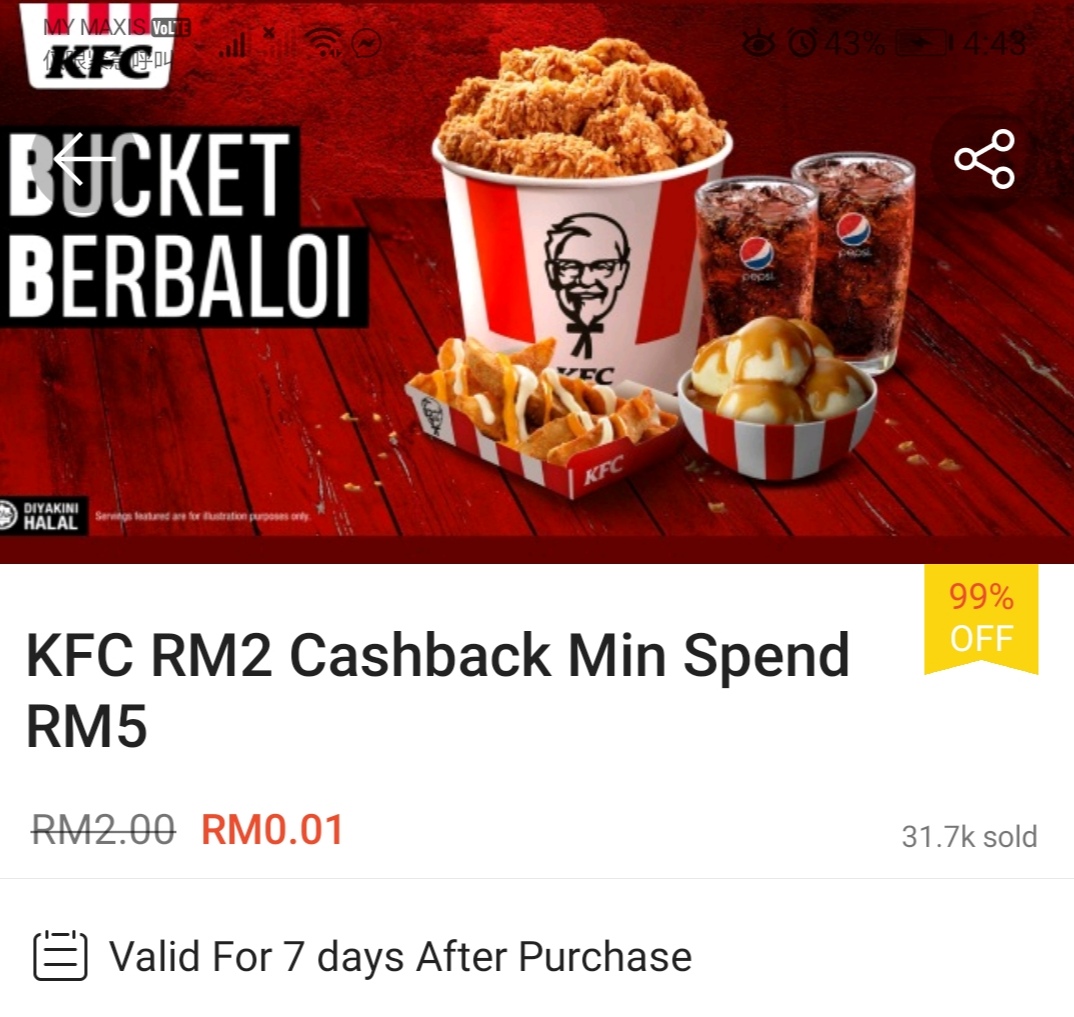 ▼ ④ KFC – 消费满RM5 可获RM2 现金回扣;购买【点击这里】