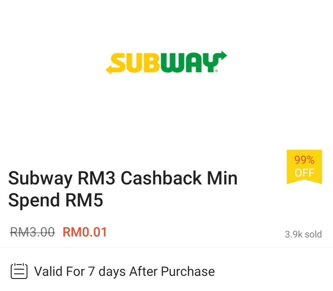 ▼ ⑨ Subway – 消费满RM5 可享有RM3 现金回扣;购买【点击这里】